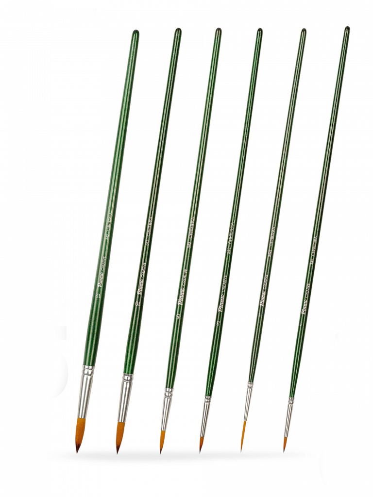 О наборе: в наборе 6 кистей с пучком круглой формы разных размеров. Характеристика: кисти этой серии изготавливаются из высококачественной синтетики золотисто-оранжевого цвета (Golden Taklon). Волос таких кистей имеет среднюю жесткость и хорошо держит свою форму. Кисти изготовлены на длинной деревянной ручке, покрытой полупрозрачным лаком зеленого цвета. Крепление ворса к черенку кисти выполнено за счет алюминиевой втулки. Применение: кисти этой серии универсальны в своем применении. Они подходят для художников всех уровней и могут использоваться для работы разными художественными красками и лаками. Производство: данный товар представлен брендом Pinax. Pinax — мировой бренд товаров, который представлен на российском рынке с начала XXI века. Изначально компания производила только кисти для художественных работ, но затем расширила свое производство и не потеряв качество своей продукции начала производить холсты, мольберты и аксессуары для художников. Сейчас ассортимент включает в себя большое количество наименований.