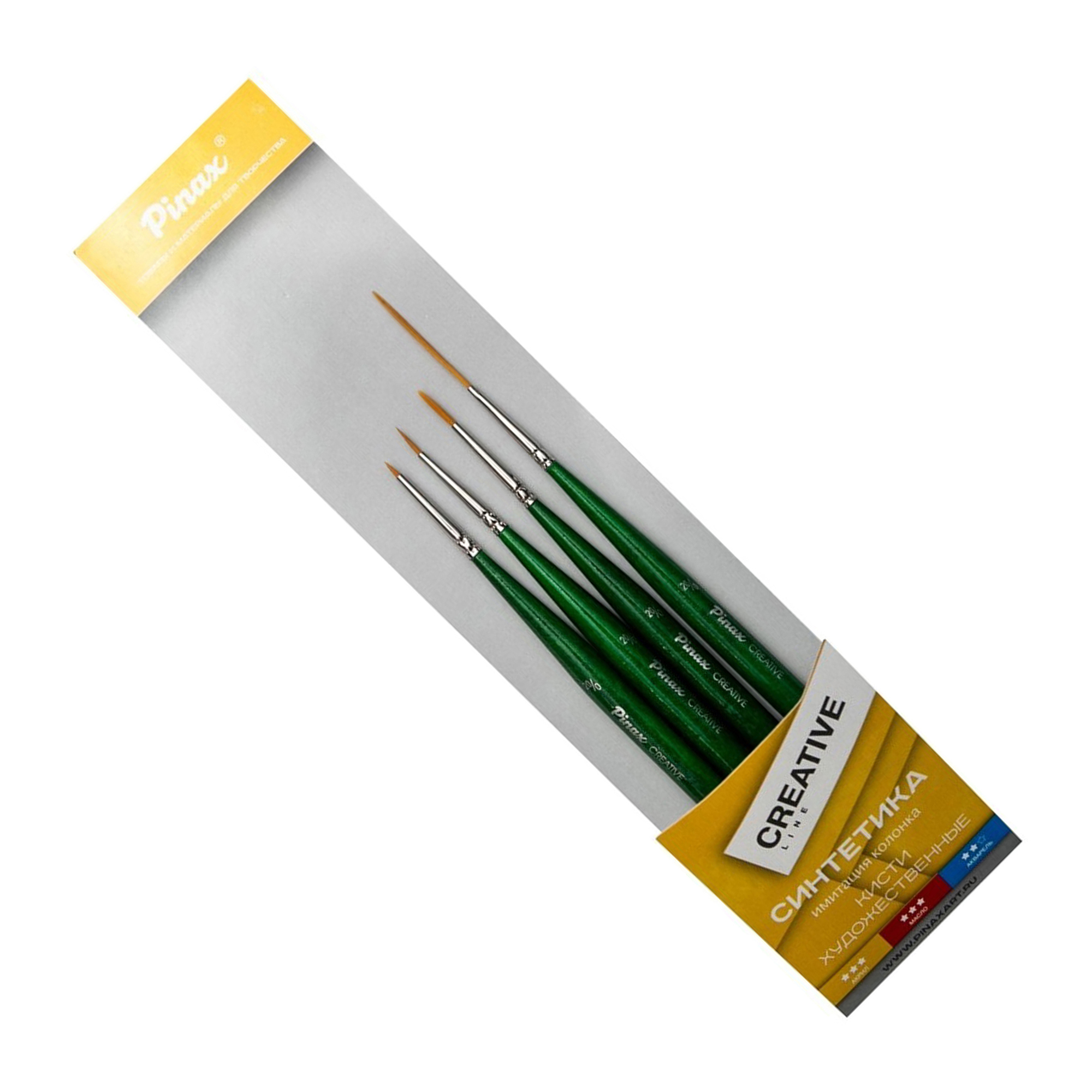 Комплектация: данный набор подобран кистями для создания миниатюр и детальной прорисовки изображений. В набор вошли кисти серии «Creative», которые изготовлены из синтетики. В набор входит 4 кисти: №20/0 (с длинной ворса 5 мм), №20/0 (с длинной ворса 8 мм), №20/0 (с длинной ворса 11 мм), №20/0 с плоской вставкой 30 мм. Блистерная упаковка. Характеристика: кисти этой серии изготавливаются из высококачественной синтетики золотисто-оранжевого цвета (Golden Taklon). Волос таких кистей имеет среднюю жесткость и хорошо держит свою форму. Кисти изготовлены на короткой утолщенной деревянной ручке, покрытой полупрозрачным лаком зеленого цвета. Крепление ворса к черенку кисти выполнено за счет алюминиевой втулки. Применение: кисти этой серии универсальны в своем применении. Они подходят для художников всех уровней и могут использоваться для работы разными художественными красками и лаками. Производство: данный товар представлен брендом Pinax. Pinax — мировой бренд товаров, который представлен на российском рынке с начала XXI века. Изначально компания производила только кисти для художественных работ, но затем расширила свое производство и не потеряв качество своей продукции начала производить холсты, мольберты и аксессуары для художников. Сейчас ассортимент включает в себя большое количество наименований.