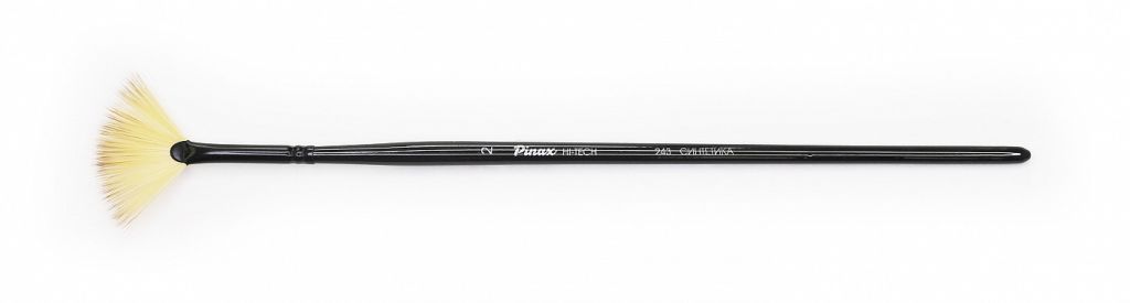 О серии: веерные кисти серии «Pinax Artists HI-TECH» изготавливаются из специальной синтетики высокого качества. Кисти данной серии выпускаются следующих размеров: №1, 3, 6. Характеристика: для изготовления веерных кистей серии «Pinax Artists HI-TECH» используется южнокорейская синтетика. Волос изготовленный из такой синтетики по своим характеристикам имитирует колонковый ворс. Кисти износостойки и устойчивы к воздействию химических растворителей. Пучок кисти имеет оригинальную форму, которая визуально напоминает веер. Кисти выполнены на короткой глянцевой деревянной ручке. На ручку нанесен орнамент, который визуально напоминает карбон покрытый лаком. Втулка хромированная медная. Применение: синтетика, которая использована при производстве кистей этой серии, делает кисти универсальными в применении. Кисти подходят для использования любителями и профессионалами во всех техниках живописи. Кисти такой формы удобны для прорисовки таких объектов, как волны, мех, трава. Так же они подходят для придания работе специальных эффектов.