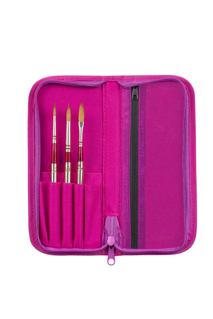 В наборе три складных кисти Oro Rosso в удобном пенале на молнии. Кисти серии Oro Rosso изготавливаются из универсальной синтетики с ворсом чуть толще имитации белки. Пучок кисти сочетает в себе беличью мягкость с упругостью и управляемостью синтетики. Кисти этой серии подходят как для любителей, так и для профессионалов. Кисти Oro Rosso подходят для декоративно-оформительского творчества и хобби. Предназначены для акварели, жидкого акрила, так же могут быть использованы и для масла в лессировочных техниках.