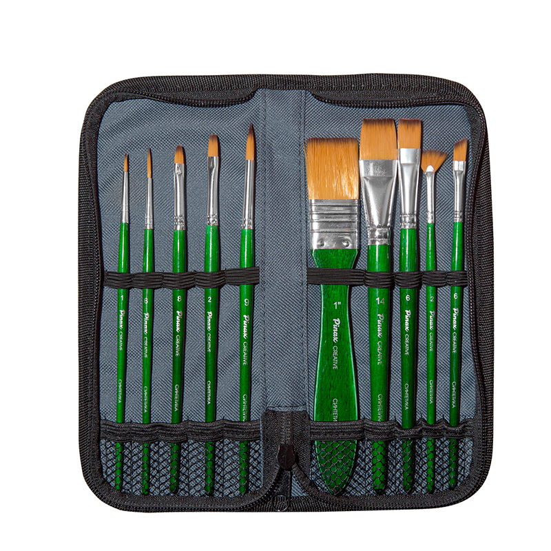 Комплектация: набор упакован в жесткий пенал для кистей. В набор вошло 10 кистей серии «Creative» из синтетического волоса (круглые №1, 6; плоские №6, 12, 3/4''; плоскоовальная 4; скошенная №1/4; веерная №2/0; лайнер №1; флейц 25мм). Характеристика: кисти этой серии изготавливаются из высококачественной синтетики золотисто-оранжевого цвета (Golden Taklon). Волос таких кистей имеет среднюю жесткость и хорошо держит свою форму. Кисти изготовлены на короткой деревянной ручке, покрытой полупрозрачным лаком зеленого цвета. Крепление ворса к черенку кисти выполнено за счет алюминиевой втулки. Применение: кисти этой серии универсальны в своем применении. Они подходят для художников всех уровней и могут использоваться для работы разными художественными красками и лаками. Производство: данный товар представлен брендом Pinax. Pinax — мировой бренд товаров, который представлен на российском рынке с начала XXI века. Изначально компания производила только кисти для художественных работ, но затем расширила свое производство и не потеряв качество своей продукции начала производить холсты, мольберты и аксессуары для художников. Сейчас ассортимент включает в себя большое количество наименований.