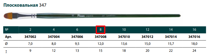 О серии: веерные кисти серии «Pinax Creative 347» изготавливаются из синтетического волокна. В данной серии представлен широкий размерный ряд кистей. Характеристика: кисти этой серии изготавливаются из высококачественной синтетики золотисто-оранжевого цвета (Golden Taklon). Волос таких кистей имеет среднюю жесткость и хорошо держит свою форму. Дополнительным преимуществом кистей из синтетического волоса считается то что он гипераллергенный. Кисти серии «Pinax Creative 347» имеют плоский пучок овальной формы. Кисти такой формы сочетают в себе свойства круглых и плоских кистей. Кисти изготовлены на длинной деревянной ручке, покрытой полупрозрачным лаком зеленого цвета. Крепление ворса к черенку кисти выполнено за счет алюминиевой втулки. Применение: кисти этой серии универсальны в своем применении. Они подходят для художников всех уровней и могут использоваться для работы разными художественными красками и лаками. Кисти такой формы, в зависимости от положения относительно поверхности, можно использовать как круглые или плоские. Производство: данный товар представлен брендом Pinax. Pinax — мировой бренд товаров, который представлен на российском рынке с начала XXI века. Изначально компания производила только кисти для художественных работ, но затем расширила свое производство и не потеряв качество своей продукции начала производить холсты, мольберты и аксессуары для художников. Сейчас ассортимент включает в себя большое количество наименований.