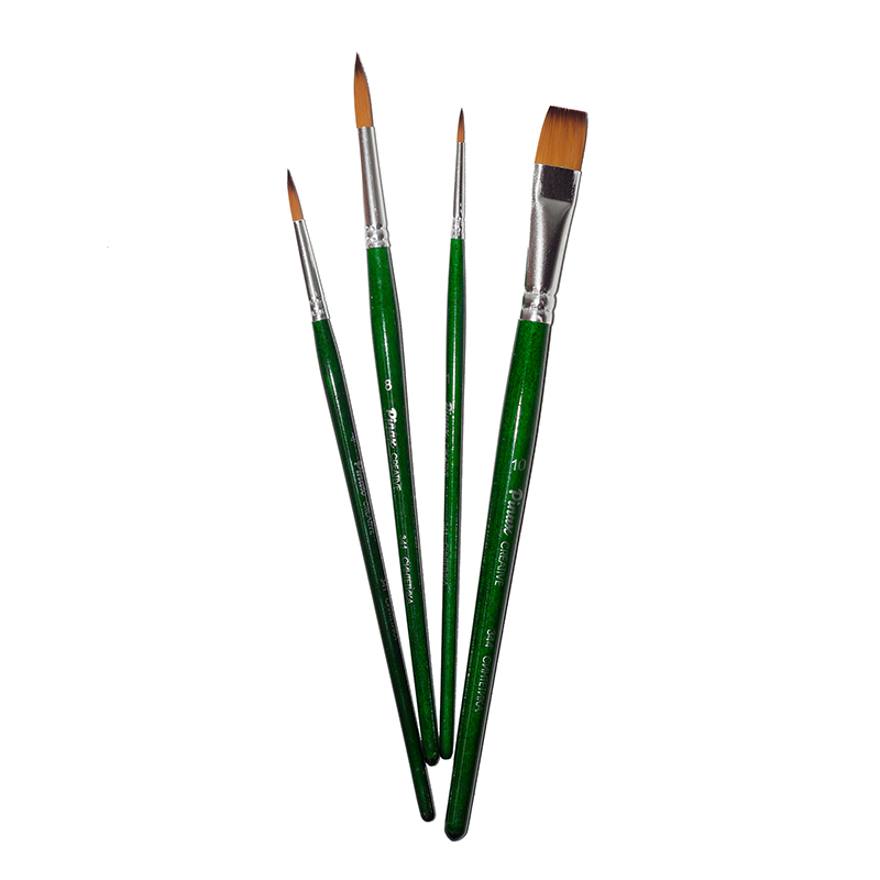 Комплектация: в данный набор вошли кисти серии «Creative», которые изготовлены из синтетики. В набор входит 4 кисти (круглые №1, 4, 8 и плоская №10). Характеристика: кисти этой серии изготавливаются из высококачественной синтетики золотисто-оранжевого цвета (Golden Taklon). Волос таких кистей имеет среднюю жесткость и хорошо держит свою форму. Кисти изготовлены на короткой деревянной ручке, покрытой полупрозрачным лаком зеленого цвета. Крепление ворса к черенку кисти выполнено за счет алюминиевой втулки. Применение: кисти этой серии универсальны в своем применении. Они подходят для художников всех уровней и могут использоваться для работы разными художественными красками и лаками. Производство: данный товар представлен брендом Pinax. Pinax — мировой бренд товаров, который представлен на российском рынке с начала XXI века. Изначально компания производила только кисти для художественных работ, но затем расширила свое производство и не потеряв качество своей продукции начала производить холсты, мольберты и аксессуары для художников. Сейчас ассортимент включает в себя большое количество наименований.