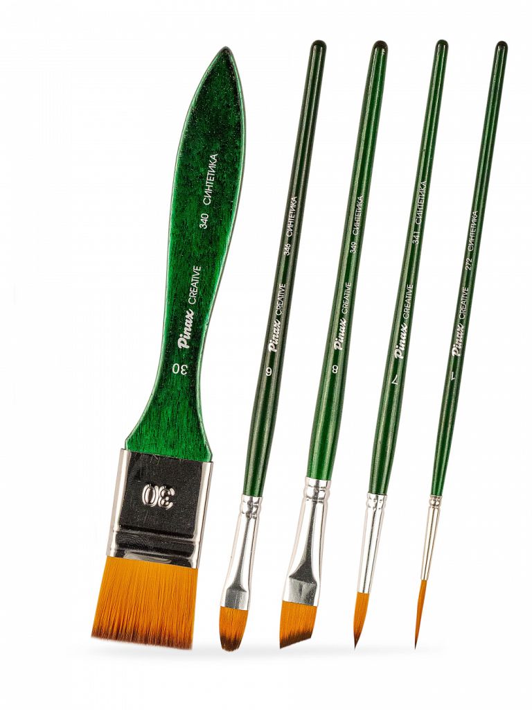 О наборе: в наборе 5 кистей с пучком разной формы разных размеров. Характеристика: кисти этой серии изготавливаются из высококачественной синтетики золотисто-оранжевого цвета (Golden Taklon). Волос таких кистей имеет среднюю жесткость и хорошо держит свою форму. Кисти изготовлены на короткой деревянной ручке, покрытой полупрозрачным лаком зеленого цвета. Крепление ворса к черенку кисти выполнено за счет алюминиевой втулки. Применение: кисти этой серии универсальны в своем применении. Они подходят для художников всех уровней и могут использоваться для работы разными художественными красками и лаками. Производство: данный товар представлен брендом Pinax. Pinax — мировой бренд товаров, который представлен на российском рынке с начала XXI века. Изначально компания производила только кисти для художественных работ, но затем расширила свое производство и не потеряв качество своей продукции начала производить холсты, мольберты и аксессуары для художников. Сейчас ассортимент включает в себя большое количество наименований.