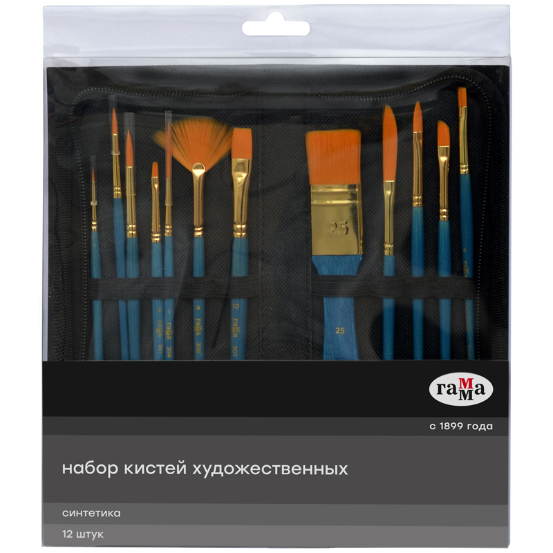 Набор художественных кистей в тканевом пенале ГАММА серии «Галерея» состоит из 12 кистей востребованных форм и размеров: круглая № 2/0; 3; 6; плоская № 2; 8; 10; веерная № 4, плоскоовальная № 6, лайнер № 1, даггер № 6, плоская скошенная № 6, флейц № 25. Набор отлично подойдёт для работы акварельными, гуашевыми и акриловыми красками. Кисти упакованы в тканевый пенал, который удобно брать с собой на пленэр или хранить кисти в студии или дома. Кисти «Галерея» изготовлены из высококачественной рыжей мягкой синтетики производства Японии. Кисти имеют короткую ручку, покрытую глянцевым лаком, и никелированную бесшовную обойму. Покрытие лаком защищает ручку кисти от воздействия красок и влаги. Ширина плоских кистей – 3,9; 7,9; 10,5; 6,1; 6,5; 6,5; 25 мм, а диаметр круглых – 1,8; 2,9; 3,8; 2,2 мм. Выставка, длина волоса от обоймы до кончика кисти, составляет 6,5; 13; 17,5; 7; 12; 14 мм. Тончайший синтетический волос, используемый при производстве кистей данной серии, позволяет хорошо набирать и отдавать краску, при этом отлично держит форму, обладает большой упругостью и позволяет лучше контролировать мазок. Кистью легко писать детали, выполнять заливки и моделировать объём. Бережно взаимодействует с бумагой, подходит для работы в технике лессировки. Кисти идеально подходят для любителей ботанической живописи. Упаковка набора – пластиковый блистер с европодвесом и картонной подложкой. • Номер: 2/0; 3; 6; 2; 8; 10; 4; 6; 1; 6; 6; 25 • Форма кисти: круглая, плоская, веерная, плоскоовальная, лайнер, даггер, плоская скошенная, флейц; • Волос: синтетика; • Серия: Галерея; • Тип ручки: короткая; • Диаметр для круглых кистей: 1,8; 2,9; 3,8; 2,2 мм; • Ширина для плоских кистей: 3,9; 7,9; 10,5; 6,1; 6,5; 6,5; 25 мм; • Выставка: 6,5; 13; 17,5; 7; 12; 14 мм.