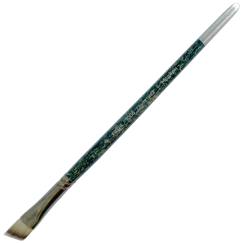 Художественные кисти ГАММА «Модерн» хорошо знакомы художникам, это одни из первых художественных кистей ГАММА. Главное отличие серии – это упругий волос средней жесткости. Плотная набивка пучка и тонкая синтетическая нить дают идеальное сочетание для живописи. Кисти хорошо набирает краску, контролируемо ее отдает, мягко отвечает на каждое движение художника. Кисти универсальны, подойдут как краски разной консистенции. Кисти имеют цельнотянутую латунную обойму, короткую ручку с эффектом мрамора. Кисти скошенной формы – плоские кисти со скошенным под углом пучком. Они используются для создания набросков и эскизов, создания точных мазков и перехода цветов.