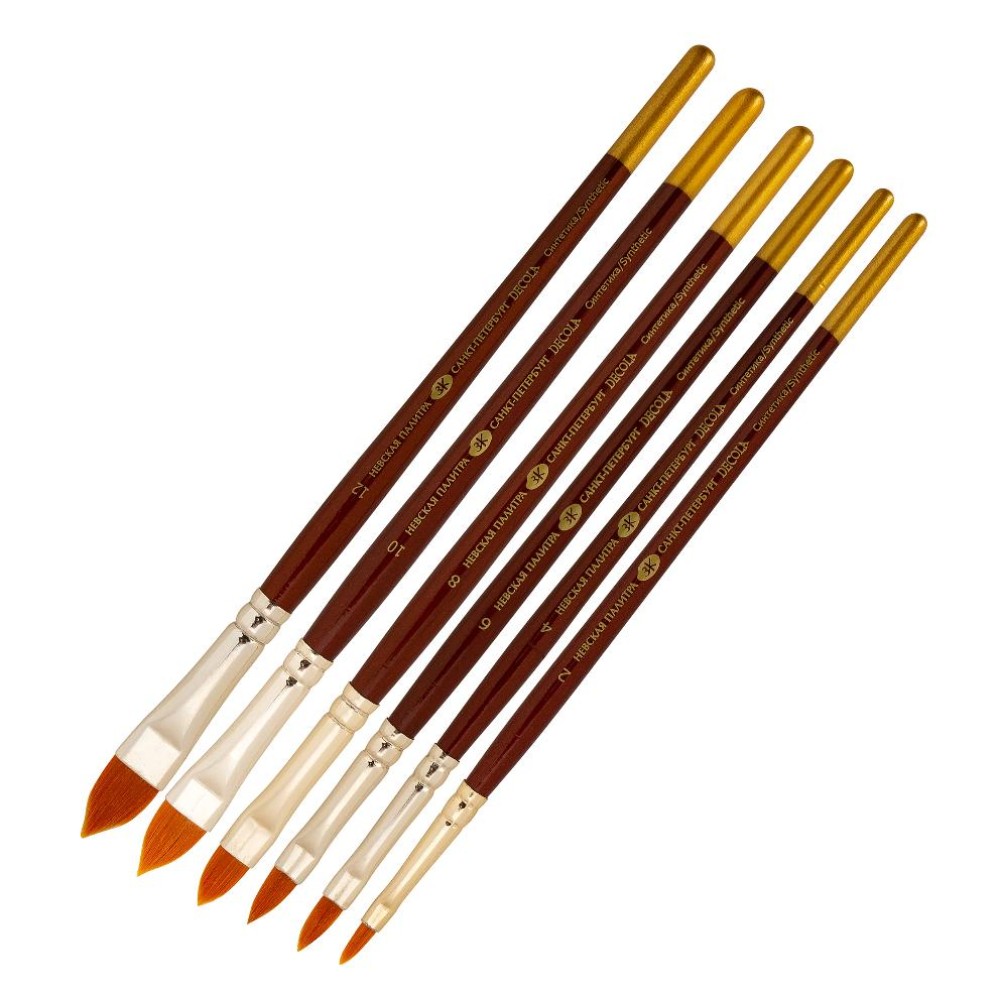 Кисти Decola из качественной синтетики средней жесткости отличаются высокой упругостью и эластичностью, подходят для большинства материалов (гуашь, акрил, масло, лаки). Средняя жесткость волоса гарантирует бережное отношение к декорируемой поверхности при использовании в хобби техниках, густой волос позволяет удерживать большое количество краски или лака. Кисти «кошачий язык» — вид плоских кистей овальной (купольной) формы. Данная форма является универсальной, совмещает в себя возможности плоских и круглых кистей, подойдет как для крупных мазков, так и для прорисовки мелких деталей. С ее помощью можно добиваться плавных цветовых переходов без отрыва руки. Кошачий язык часто применяют в ботанической живописи. Обойма кистей металлическая, хромированная. Ручка короткая, пропитана лаком, окрашена цветом «темная медь».