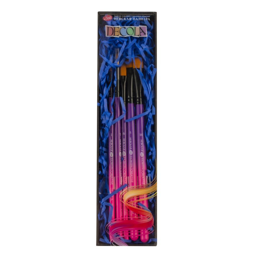Синтетические кисти Decola с металлической ручкой из прочного и лёгкого металла, что придает кисти долговечность и устойчивость. Металлическая ручка также обеспечивает удобство в использовании и позволяет художнику легко контролировать движения кисти. Это особенно важно при выполнении тонких и детальных работ. Ворс кистей сделан из синтетики и имеет преимуществ перед натуральным, включая устойчивость к химическим воздействиям, долговечность и возможность использования с широким спектром красок. Кисти подходят для работы с различными типами красок, включая акрил, масло, водные краски и гуашь. Состав набора: № 1, 5 круглая, короткая ручка; № 10 плоская, короткая ручка; № 5 скошенная, короткая ручка; № 6 овальная, короткая ручка.