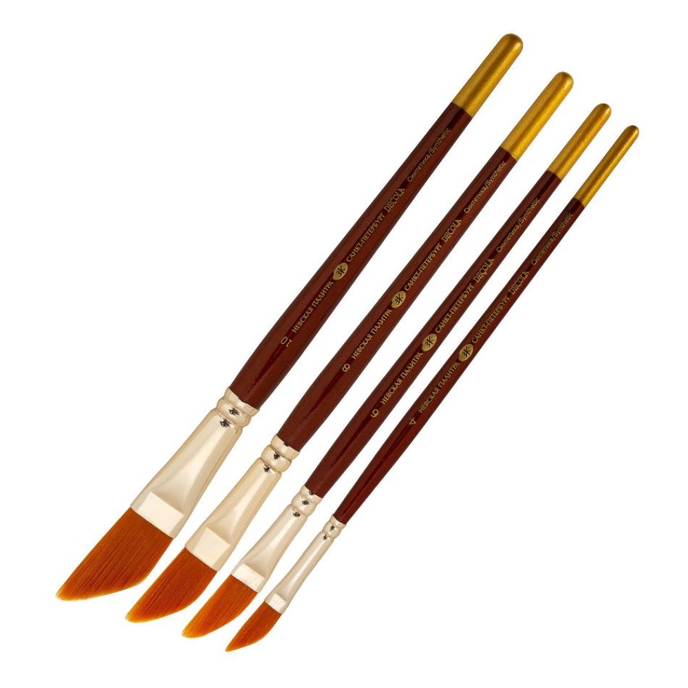 Кисти Decola из качественной синтетики средней жесткости отличаются высокой упругостью и эластичностью, подходят для большинства видов красок. Средняя жесткость волоса гарантирует бережное отношение к декорируемой поверхности при использовании в хобби техниках, густой волос позволяет удерживать большое количество краски и воды. Кисти даггер (даггер лайнер) имеют саблевидную форму. С их помощью можно создавать как тонкие прямые линии, так и крупные широкие мазки. Кисти даггер часто используют для создания декоративных элементов с плавными цветовыми переходами. Обойма кистей металлическая, хромированная. Ручка короткая, пропитана лаком, окрашена цветом «темная медь». Размерный ряд: 4, 6, 8, 10.