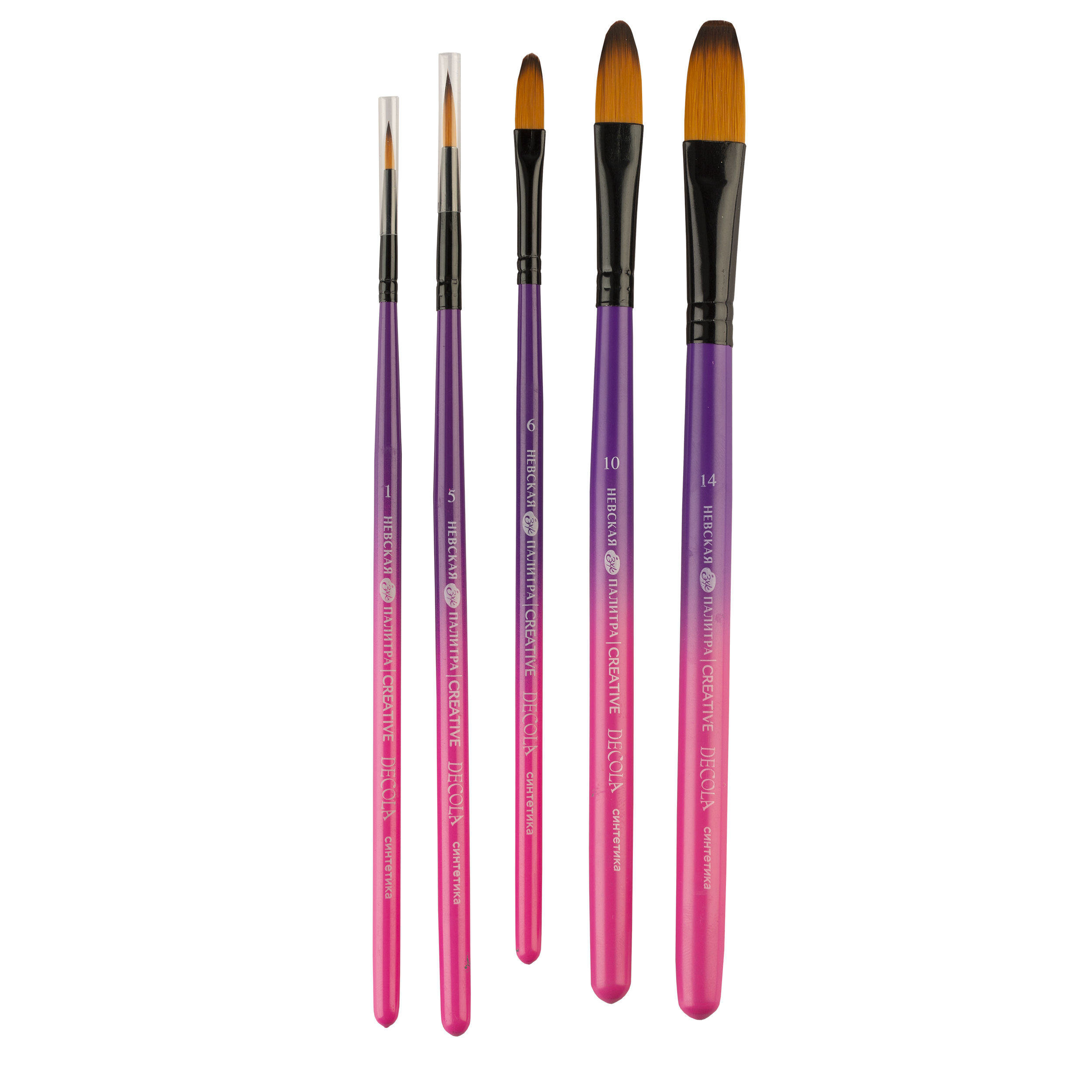 Синтетические кисти Decola с металлической ручкой из прочного и лёгкого металла, что придает кисти долговечность и устойчивость. Металлическая ручка также обеспечивает удобство в использовании и позволяет художнику легко контролировать движения кисти. Это особенно важно при выполнении тонких и детальных работ. Ворс кистей сделан из синтетики и имеет преимуществ перед натуральным, включая устойчивость к химическим воздействиям, долговечность и возможность использования с широким спектром красок. Кисти подходят для работы с различными типами красок, включая акрил, масло, водные краски и гуашь. Состав набора: № 1, 5 круглая, короткая ручка; № 6, 10, 14 овальная, короткая ручка.