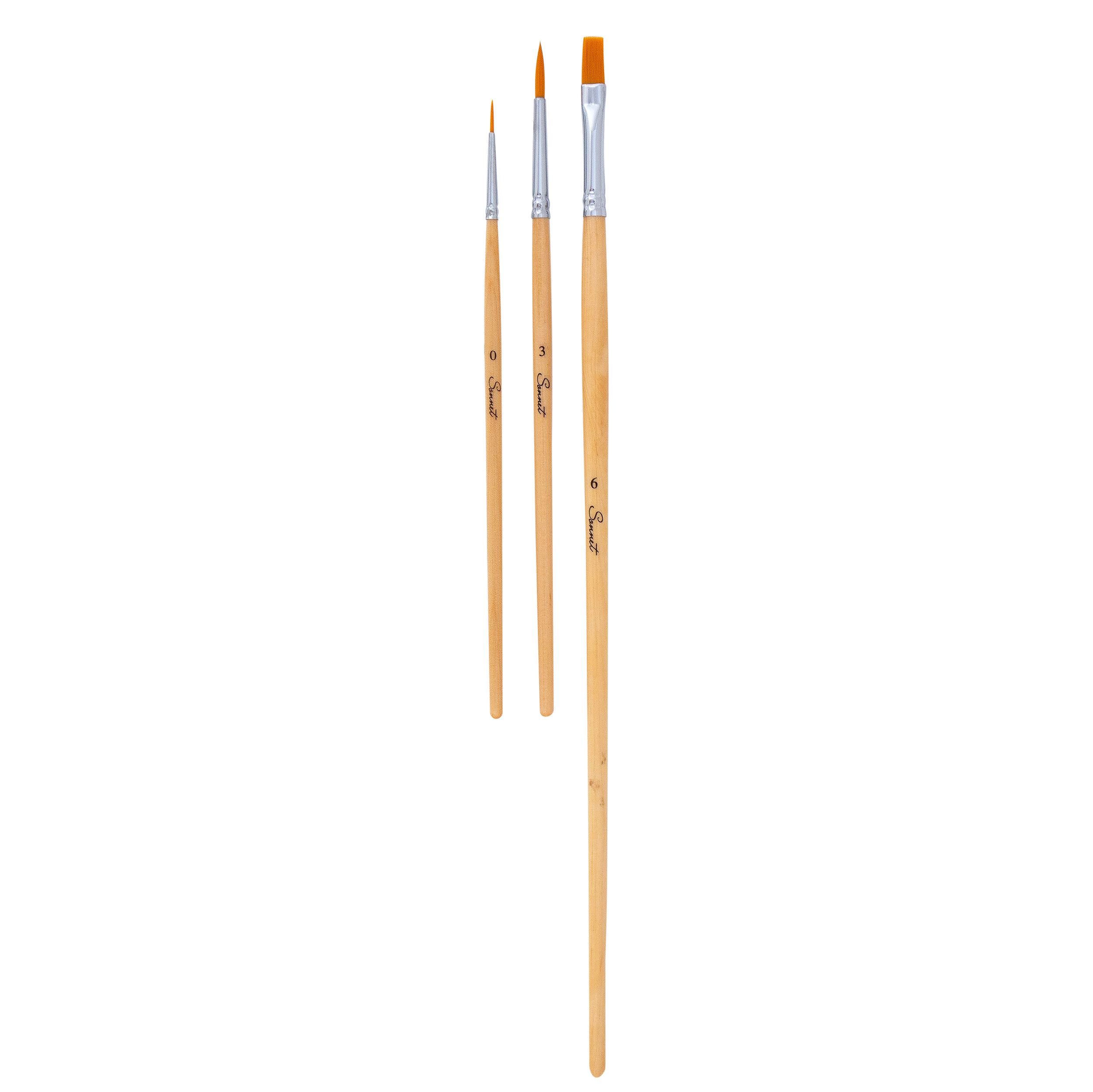 Кисти собраны из конусообразных щетинок, имитирующих натуральный волос средней жёсткости. В наборе представлены плоские кисти для создания чётких ровных линий и больших заливок, а также круглые кисти для прорисовки деталей и фактуры. Применяются для работы маслом, акрилом, гуашью, темперой, лаками. В наборе плоская кисть №6 и круглые кисти на короткой ручке №0 и №3.