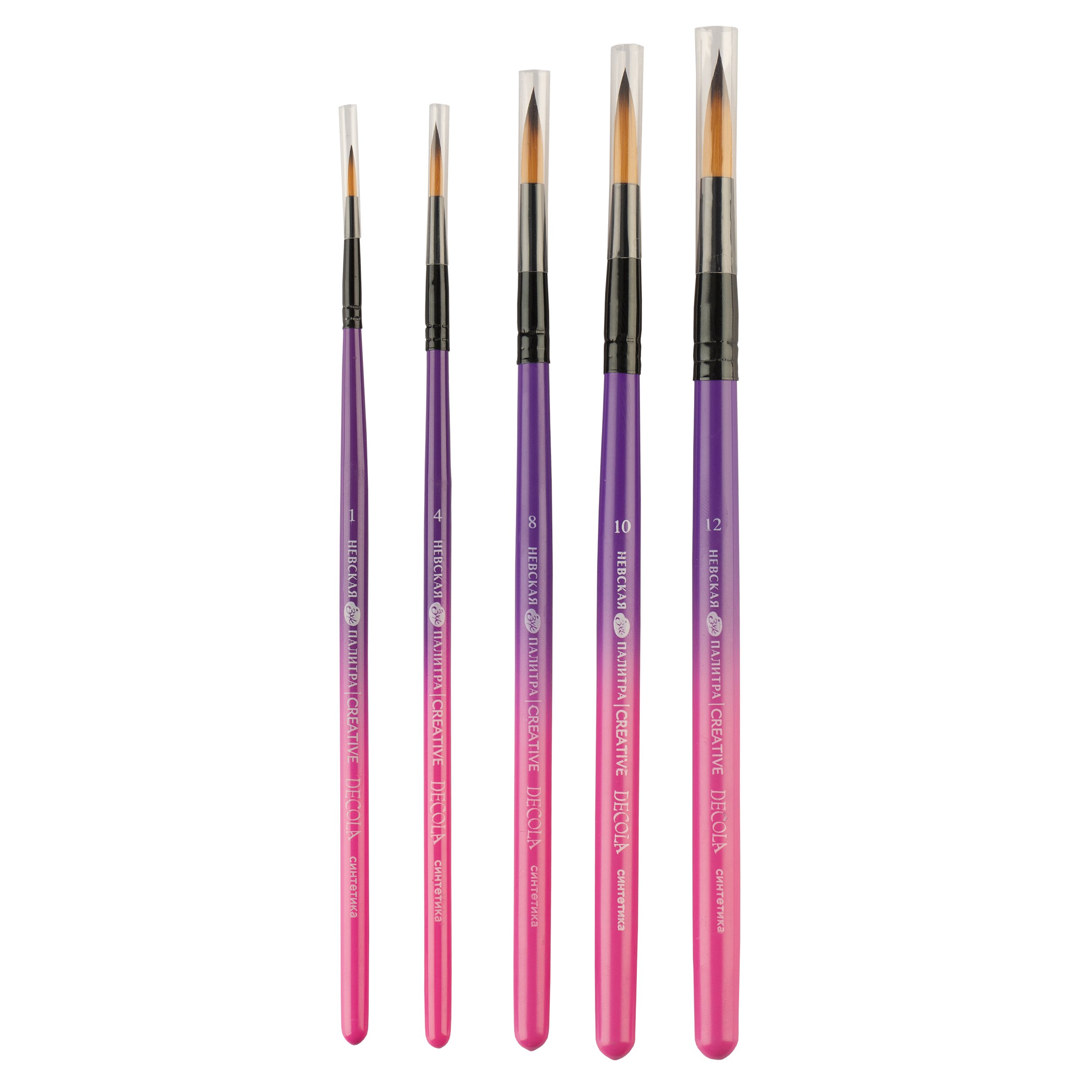Синтетические кисти Decola с металлической ручкой из прочного и лёгкого металла, что придает кисти долговечность и устойчивость. Металлическая ручка также обеспечивает удобство в использовании и позволяет художнику легко контролировать движения кисти. Это особенно важно при выполнении тонких и детальных работ. Ворс кистей сделан из синтетики и имеет преимуществ перед натуральным, включая устойчивость к химическим воздействиям, долговечность и возможность использования с широким спектром красок. Кисти подходят для работы с различными типами красок, включая акрил, масло, водные краски и гуашь. Состав набора: № 1, 4, 8, 10, 12 круглая, короткая ручка.