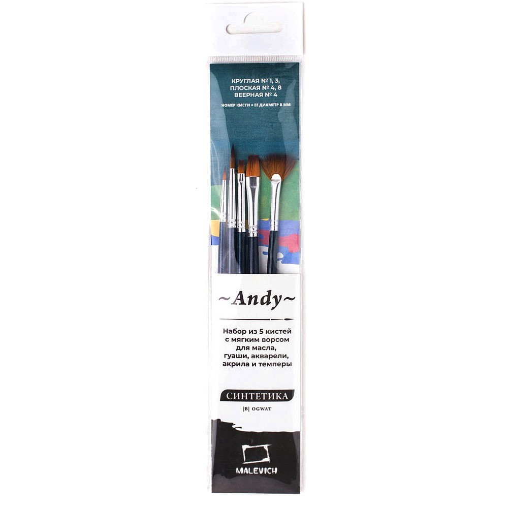 Кисти из синтетики серии "Энди" от компании "Малевичъ" — это мягкая универсальная синтетика, которая подходит практически для любых видов красок. Этими кистями удобно работать с гуашью, акварелью, акрилом, темперой. Они также подходят для работы масляными красками в лессировочной технике с разбавителем. Синтетический ворс - рыжего цвета с темным кончиком. Ручки кистей покрыты зеленовато-синим лаком. Ворс закреплен аллюминиевой втулкой с двойным обжимом. Привлекательный внешний вид дополняет удобная лаконичная маркировка. Ручка - короткая (14см). Выставка (длина ворса) - короткая. Номер кисти соответствует диаметру обоймы в миллиметрах. В набор входят 5 кистей: круглые кисти №1 и №3, плоские №4 и №8, веерная №4.