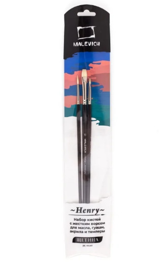 Кисти серии "Henry" производятся из натуральной свиной щетины самого высокого качества (Interlocked Chungking bristle). Благодаря расщепленному кончику кисть хорошо впитывает и разносит краску. Короткая выставка позволяет делать короткие, упругие мазки и работать с густой краской. Кисть на классической длиной ручке из березы покрытой черным лаком, обойма из латуни с покрытием никель-хром. Кисти идеальны для пастозной живописи маслом и акрилом. Номер кисти соответствует диаметру в мм. В наборе: круглая кисть - №3, плоские - №6, №10.