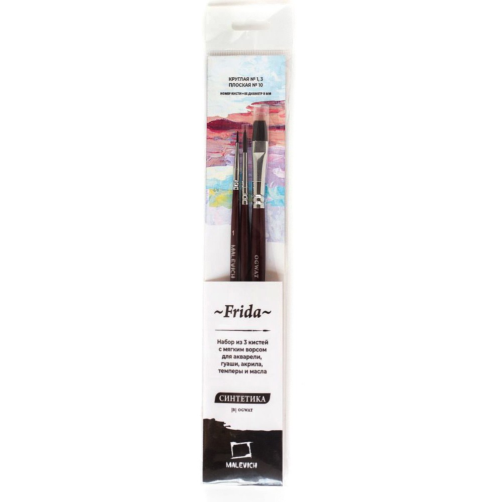 Синтетические нейлоновые кисти серии "Frida" от Малевичъ - это кисти с мягким эластичным ворсом. Имеют острый кончик, который долго не стирается. Подходят для акварели и гуаши, хороши для академической техники живописи и лессировок, хорошо держат воду. По свойствам напоминают натуральную белку. Латунная обойма с антикоррозийным покрытием и двойным обжимом. Березовая ручка длиной 18см покрыта глянцевым темно-красным лаком. Длина ворса (выставка) короткая. Номер кисти соответствует диаметру в мм. В набор входят 3 кисти: круглые кисти №1 и №3, плоская №10.