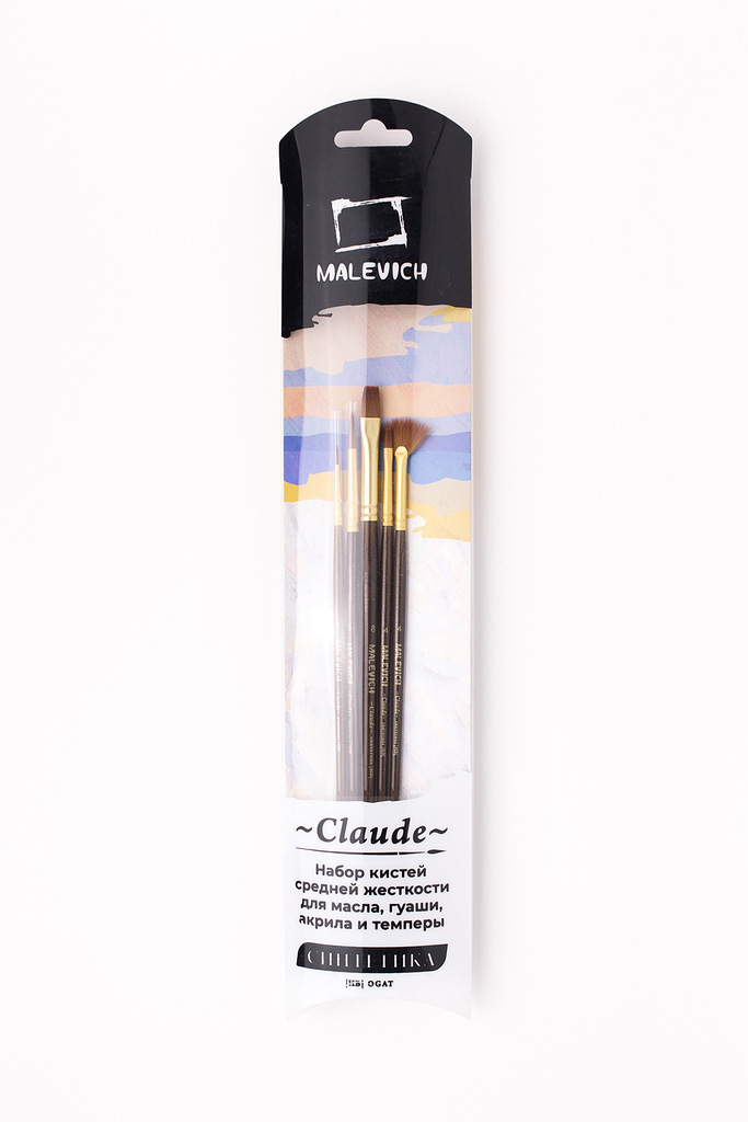 Кисти серии "Claude" ("Клод") от компании "Малевичъ" изготовлены из синтетики золотистого цвета (Shining golden synthetic), имитирующей колонковый волос. Золотистая синтетика это - ворс средней жесткости, который отлично подходит для густых красок: для масла, акрила, гуаши, темперы. Кисти выполнены в благородной цветовой гамме: матовая золотая втулка, коричневый прозрачный лак и лаконичная маркировка делают эти кисти не только надежным художественным инструментом, но и красивым аксессуаром. Кисть держит свою форму даже при частом использовании, ворс прочно закреплен, а втулка не расшатывается со временем.