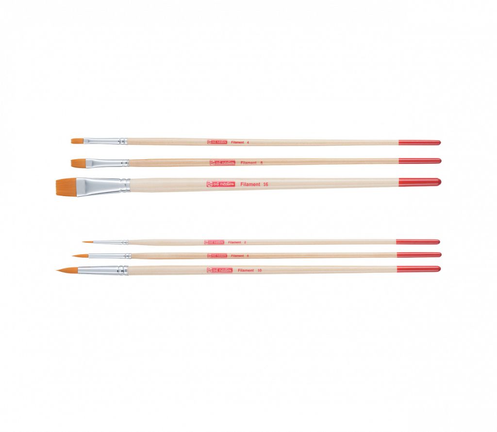 Характеристика: кисти изготовлены из жесткой синтетики (полиэстера). Ворс таких кистей оранжевого цвета, средней жесткости. Отличительной особенностью таких кистей является высокой износостойкость. Применение: кисти из синтетики универсальны в применении. Хорошо проявляют свои свойства при работе с маслом, акрилом и гуашью. Производство: производится в городе Апелдорн голландской компанией ROYAL TALENS, которую основал Мартин Таленс (MartenTalens) в 1899 году. «ROYAL TALENS» производит все виды художественных красок и является одним из ведущих производителей в своей отрасли.