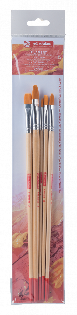 Комплектация: набор состоит из кистей, изготовленных из синтетического ворса. В наборе 5 кистей разной формы: плоские №10 и №14, круглая №6, овальные со слегка заостренным кончиком (кошачий язык)№10, 14. Блистерная упаковка. Характеристика: кисти изготовлены из жесткой синтетики (полиэстера). Ворс таких кистей оранжевого цвета, средней жесткости. Отличительной особенностью таких кистей является высокой износостойкость. Применение: кисти, входящие в данный набор, универсальны в применении. Хорошо проявляют свои свойства при работе с маслом, акрилом и гуашью. Производство: производится в городе Апелдорн голландской компанией «ROYAL TALENS», которую основал Мартин Таленс (MartenTalens) в 1899 году. «ROYAL TALENS» производит все виды художественных красок и является одним из ведущих производителей в своей отрасли.