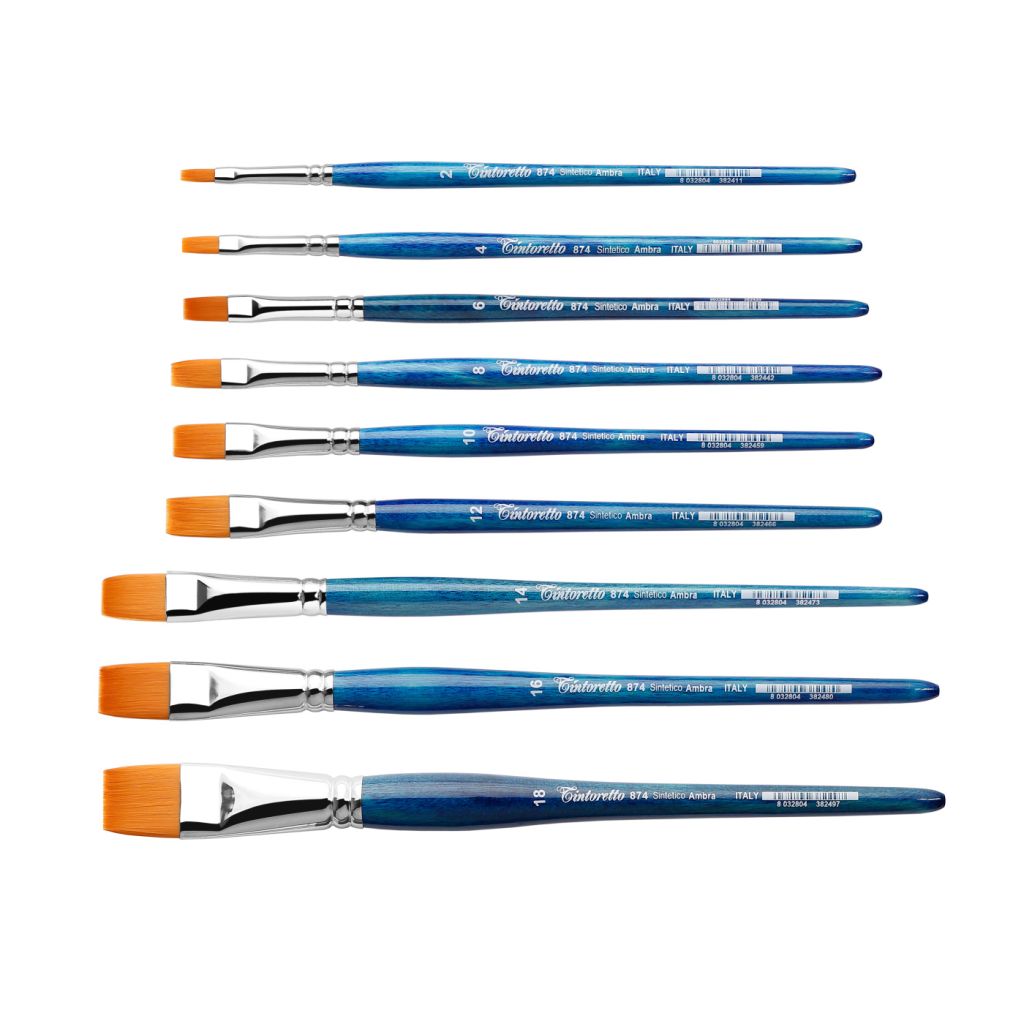 Кисти изготовлены из классической универсальной синтетики на короткой ручке. Такие кисти могут использоваться с различными видами красок, идеальны для творчества, школы и хобби. Обладают средними показателями мягкости и упругости и высокой износоустойчивостью.
