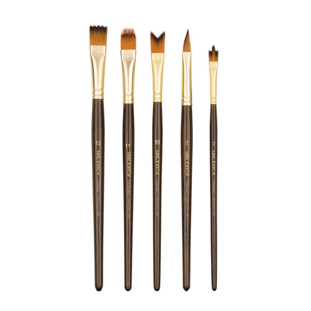 Кисти для рисования серии Claude от «Малевичъ» изготовлены из синтетики золотистого цвета (Shining golden synthetic), имитирующей ворс колонка. Это ворс средней жесткости, который отлично подходит для густых красок таких как акрил, гуашь, темпера, масло (масляных красок). Кисточки для рисования выполнены в благородной цветовой гамме. Матовая золотая втулка, коричневый прозрачный лак и лаконичная маркировка делают эти кисти не только надежным художественным инструментом, но и красивым аксессуаром. Кисть «Малевичъ» держит свою форму даже при частом использовании, ворс прочно закреплен, а втулка не расшатывается со временем. Ручка кисти оптимальной средней длины - около 18 см. Длина ворса (выставка) короткая. Номер кисти соответствует диаметру ворса около втулки в мм. Новые формы полюбившихся кистей Claude: Кисть Рельеф. Плоская кисть с фигурным краем. Для фигурных мазков. Кисть Гребешок. Плоская кисть с двумя уровнями выставки ворса. Хорошо подходит для быстрой прорисовки шерсти, волос или травы. Кисть Трезубец. Плоская кисть с ребристым краем ворса. Для фигурных мазков. Кисть Ласточкин хвост. Плоская кисть с фигурным ворсом, напоминающим хвост ласточки. Кисть Объемный треугольник. Особая сборка кисти в форме треугольника сочетает в себе даггер и лайнер, а также свойства скошенной и круглой кисти. Упругий эластичный ворс кистей «Малевичъ» позволяет создавать фактурный мазок, подобно натуральной щетине. Средняя ручка будет удобна как для живописи за мольбертом, так и за столом, и с большими форматами. Для эффектных мазков рекомендуем попробовать сочетать на кисти две краски, например, один цвет набрать только на кончик и провести фигурные линии.