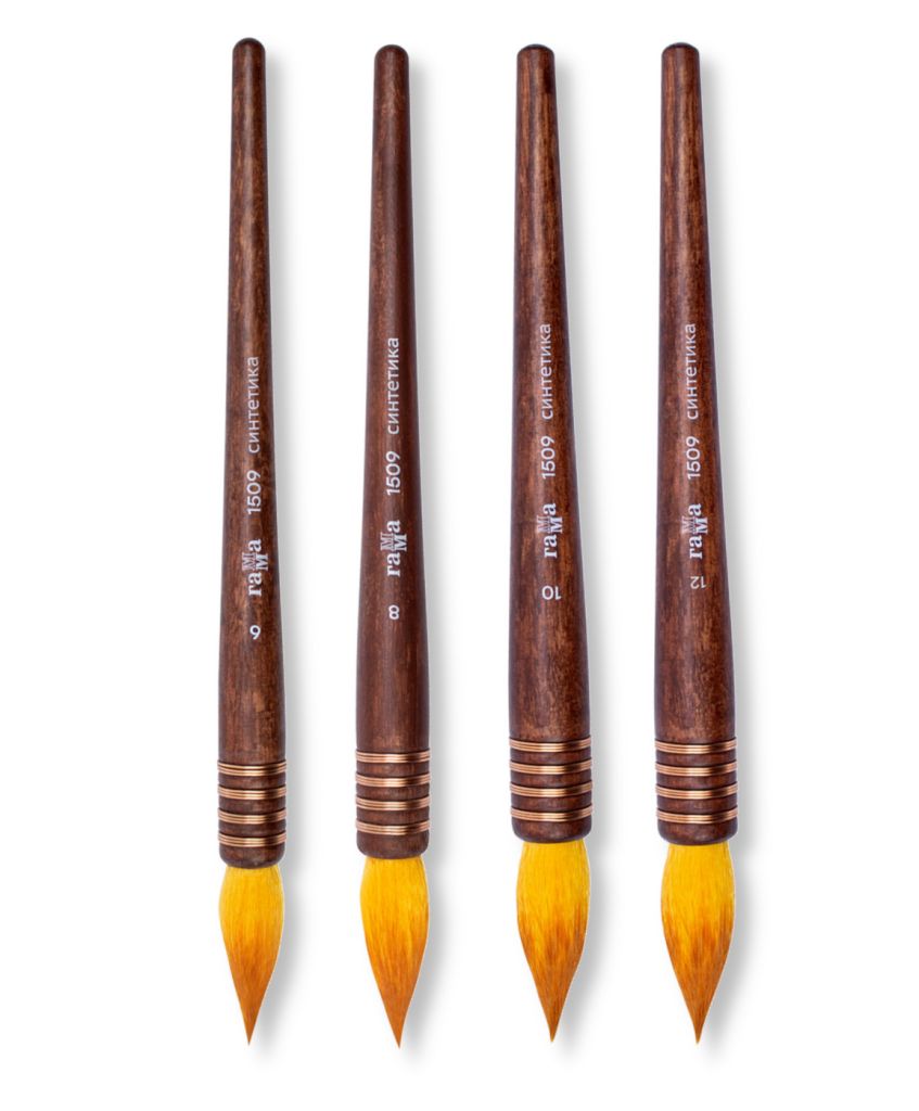 Художественные кисти ГАММА идеально подходят для каллиграфии и акварельной живописи. Длинный упругий синтетический волос средней жесткости с волной позволяет набирать много воды и контролируемо отдавать его. Кисть хорошо набирает краску, мягко отвечает на каждое движение художника. За счет особенностей крепления она набирает наибольшее количество воды и долго отдает в процессе работы. Качественная сборка позволяет кисти держать острую вершинку для создания самых тонких элементов.