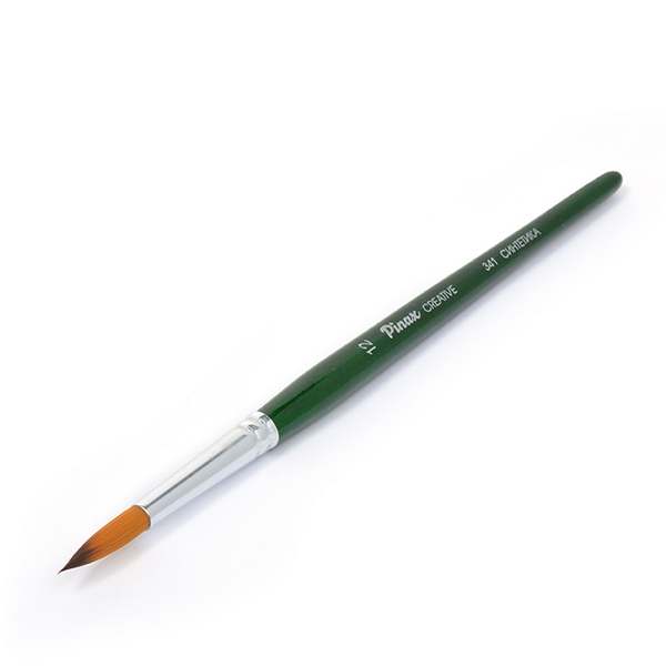 О серии: веерные кисти серии «Pinax Creative 341» изготавливаются из синтетического волокна. В данной серии представлен широкий размерный ряд кистей. Характеристика: кисти этой серии изготавливаются из высококачественной синтетики золотисто-оранжевого цвета (Golden Taklon). Волос таких кистей имеет среднюю жесткость и хорошо держит свою форму. Дополнительным преимуществом кистей из синтетического волоса считается то что он гипераллергенный. Кисти серии «Pinax Creative 341» имеют круглый пучок с заостренным кончиком. Кисти изготовлены на короткой деревянной ручке, покрытой полупрозрачным лаком зеленого цвета. Крепление ворса к черенку кисти выполнено за счет алюминиевой втулки. Применение: кисти этой серии универсальны в своем применении. Они подходят для художников всех уровней и могут использоваться для работы разными художественными красками и лаками. Производство: данный товар представлен брендом Pinax. Pinax — мировой бренд товаров, который представлен на российском рынке с начала XXI века. Изначально компания производила только кисти для художественных работ, но затем расширила свое производство и не потеряв качество своей продукции начала производить холсты, мольберты и аксессуары для художников. Сейчас ассортимент включает в себя большое количество наименований.