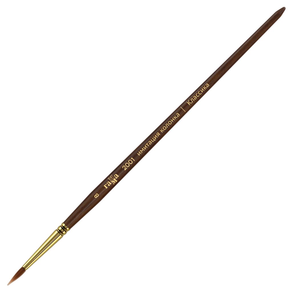 Художественные кисти «ГАММА» изготовлены из высококачественной синтетики, имитирующей ворс колонка. Изделия предназначены для работы с акварельными, гуашевыми и акриловыми красками. Кисть имеет свойствами натурального колонка, но при этом обладают повышенной износоустойчивостью. Кисть вяжут из волосков разной длины, что позволяет при соприкосновении наполненной кисти с поверхностью создать капиллярный поток краски.