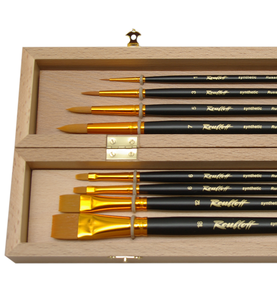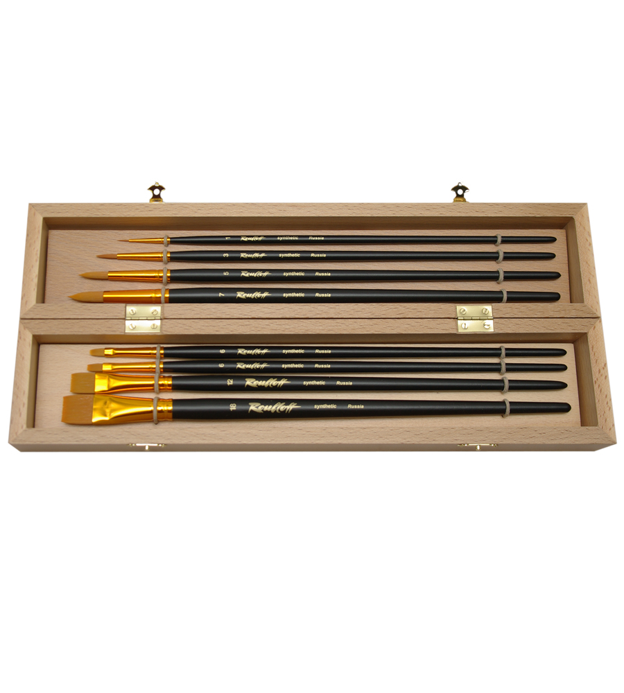 Комплектация: в набор входит 8 кистей из синтетики (круглые №1, 3, 5, 7; плоские №6, 12, 18 и овальная №6). Набор упакован в подарочную коробку из бука. Характеристика: кисти, входящие в этот набор изготовлены из синтетического волоса рыжего цвета. Синтетика, использованная для производства этих кистей, отличается жесткостью и упругостью. Синтетика более долговечная и износостойкая, чем кисти из натурального ворса. Кисти выполнены на длинной черной матовой ручке. Ворс вклеен химически-стойким клеем и надежно прикреплен обоймой из анодированного алюминия. Применение: кисти из такого материала универсальны, они подходят для выполнения художественных работ такими материалами, как акрил, масло, гуашь. На усмотрение художника кисти могут быть использованы для работы с другими художественными материалами. Производство: изготавливаются под брендом Roubloff, который был основан в 1988 году в Кировской области (Россия). Кировская область – один из центров народных промыслов в России. Здесь же занимаются разведением пушных зверей, чей мех является идеальным материалом для кистей. Продукция бренда Roubloff – кисти самого разного назначения, размера и формы. Весь материл, используемый при производстве продукции, проходит отбор, чтобы каждый клиент получил лучшие кисти для своих работ. Кисти марки Roubloff являются одними из лучших в России.