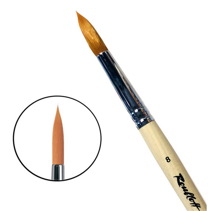 О серии: кисти серии «1210» изготавливаются из мягкой синтетики рыжего цвета. Размерный ряд представлен кистями от №00 до №10. Характеристика: кисти серии «1210» изготавливаются из специально разработанной мягкой синтетики рыжего цвета. Такой ворс подходит для работы с жидкими красками. Свойства кисти позволяют набирать и удерживать большое количество краски. Пучок кисти имеет круглую форму с заостренным кончиком. Крепление пучка к древку кисти выполнено медной хромированной обоймой. Кисть изготовлена на короткой ручке пропитанной лаком. Применение: кисти подходят для работы с жидкими красами и для нанесения лаков. На усмотрение художника кисти можно использовать в других техниках живописи. Производство: изготавливаются под брендом Roubloff, который был основан в 1988 году в Кировской области (Россия). Кировская область – один из центров народных промыслов в России. Здесь же занимаются разведением пушных зверей, чей мех является идеальным материалом для кистей. Продукция бренда Roubloff – кисти самого разного назначения, размера и формы. Весь материл, используемый при производстве продукции, проходит отбор, чтобы каждый клиент получил лучшие кисти для своих работ. Кисти марки Roubloff являются одними из лучших в России.