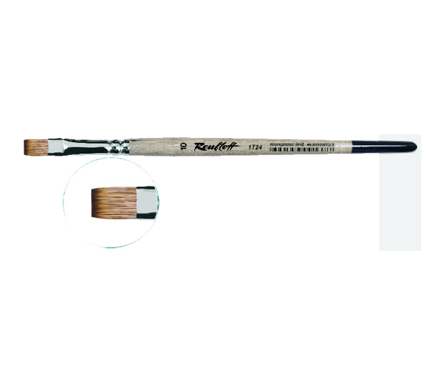 О серии: кисти серии «1Т24» изготавливаются из синтетики, имитирующей волос мангуста. В серии представлены кисти от №2 до №20. Характеристика: для изготовления кистей этой серии использован синтетический волос, который по своим свойствам максимально напоминает ворс мангуста. Кисти из такого материала более жёсткие, чем кисти из белки, но мягче кистей из щетины. Волос кисти не равномерно окрашен: по длине бело-коричневый, а у кончика кисти более темный. Кисть плоская с укороченной вставкой (ворс короткий). Крепление ворса к черенку осуществлено за счет медной хромированной обоймы. Кисть выполнена на пёстрой ручке покрытой глянцевым лаком. Применение: кисти серии «1Т24» в основном используются для работы с акварельными красками. Кисть удобна для прорисовки прямых линий и прямоугольных форм. На усмотрение художника возможно использование кистей в других техниках живописи. Производство: изготавливаются под брендом Roubloff, который был основан в 1988 году в Кировской области (Россия). Кировская область – один из центров народных промыслов в России. Здесь же занимаются разведением пушных зверей, чей мех является идеальным материалом для кистей. Продукция бренда Roubloff – кисти самого разного назначения, размера и формы. Весь материл, используемый при производстве продукции, проходит отбор, чтобы каждый клиент получил лучшие кисти для своих работ. Кисти марки Roubloff являются одними из лучших в России.