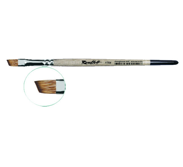 О серии: кисти серии «1Т64» изготавливаются из синтетики, имитирующей волос мангуста. В серии представлены кисти от №4 до №14. Характеристика: для изготовления кистей этой серии использован синтетический волос, который по своим свойствам максимально напоминает ворс мангуста. Кисти из такого материала более жёсткие, чем кисти из белки, но мягче кистей из щетины. Волос кисти не равномерно окрашен: по длине бело-коричневый, а у кончика кисти более темный. Кисть плоская со скошенным срезом с укороченной вставкой (ворс короткий). Крепление ворса к черенку осуществлено за счет медной хромированной обоймы. Кисть выполнена на пёстрой ручке покрытой глянцевым лаком. Применение: кисти серии «1Т64» в основном используются для работы с акварельными красками. Форма кисти удобна для детальной прорисовки отдельных мазков. На усмотрение художника возможно использование кистей в других техниках живописи. Производство: изготавливаются под брендом Roubloff, который был основан в 1988 году в Кировской области (Россия). Кировская область – один из центров народных промыслов в России. Здесь же занимаются разведением пушных зверей, чей мех является идеальным материалом для кистей. Продукция бренда Roubloff – кисти самого разного назначения, размера и формы. Весь материл, используемый при производстве продукции, проходит отбор, чтобы каждый клиент получил лучшие кисти для своих работ. Кисти марки Roubloff являются одними из лучших в России.