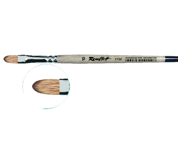 О серии: кисти серии «1Т34» изготавливаются из синтетики, имитирующей волос мангуста. В серии представлены кисти от №4 до №14. Характеристика: для изготовления кистей этой серии использован синтетический волос, который по своим свойствам максимально напоминает ворс мангуста. Кисти из такого материала более жёсткие, чем кисти из белки, но мягче кистей из щетины. Волос кисти не равномерно окрашен: по длине бело-коричневый, а у кончика кисти более темный. Кисть имеет форму плоского овала с укороченной вставкой (ворс короткий). Крепление ворса к черенку осуществлено за счет медной хромированной обоймы. Кисть выполнена на пёстрой ручке покрытой глянцевым лаком. Применение: кисти серии «1Т34» в основном используются для работы с акварельными красками.. На усмотрение художника возможно использование кистей в других техниках живописи. Производство: изготавливаются под брендом Roubloff, который был основан в 1988 году в Кировской области (Россия). Кировская область – один из центров народных промыслов в России. Здесь же занимаются разведением пушных зверей, чей мех является идеальным материалом для кистей. Продукция бренда Roubloff – кисти самого разного назначения, размера и формы. Весь материл, используемый при производстве продукции, проходит отбор, чтобы каждый клиент получил лучшие кисти для своих работ. Кисти марки Roubloff являются одними из лучших в России.