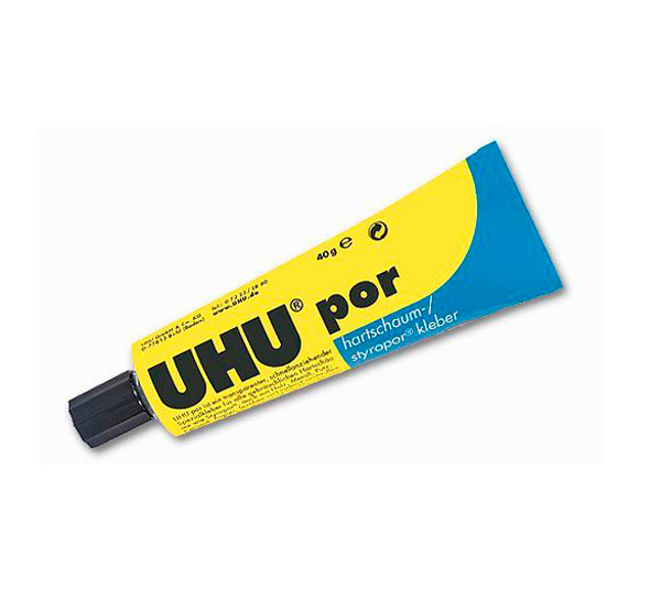 Клей универсальный UHU Por. Клей на основе искусственного каучука для склеивания разных сортов пенопласта, как между собой, так и в сочетании с другими материалами (деревом, бумагой, текстилем, металлом, керамикой и др.). Применим для склеивания цветных сортов бумаги со специальной пропиткой, а также фотобумаги. Клей нейтрален, устойчив к воздействию воды, при высыхании становится практически бесцветным. Сохраняет устойчивость в температурном диапазоне от -25°С до +60°С. Вес: 50 г.