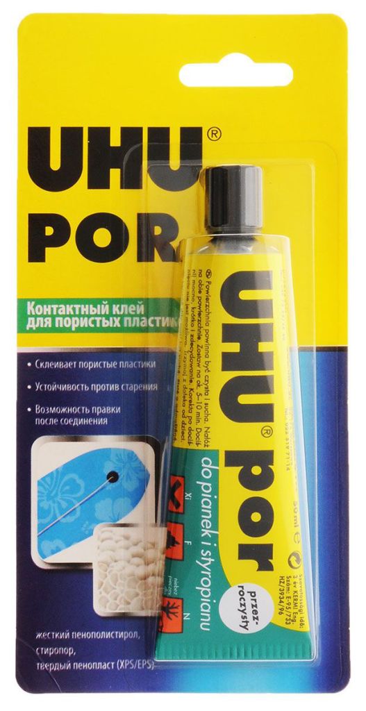 Быстросхватывающийся контактный клей с отличной устойчивостью против старения, специально для склеивания жесткого пенополистирола (например "Стиропора"), а также в соединениях с другими материалами. UHU Рor обеспечивает быстро схватывающуюся, эластичную липкую пленку с продолжительным сроком застывания и возможностью поправки после соединения поверхностей. Состав на основе растворителей, не разрушающих структуру пены пенопласта. POR идеально подходит для склеивания твердых пенопластиков друг с другом, а также с деревянными материалами, бумагой, текстилем, металлом, керамикой и пластиками различного вида.