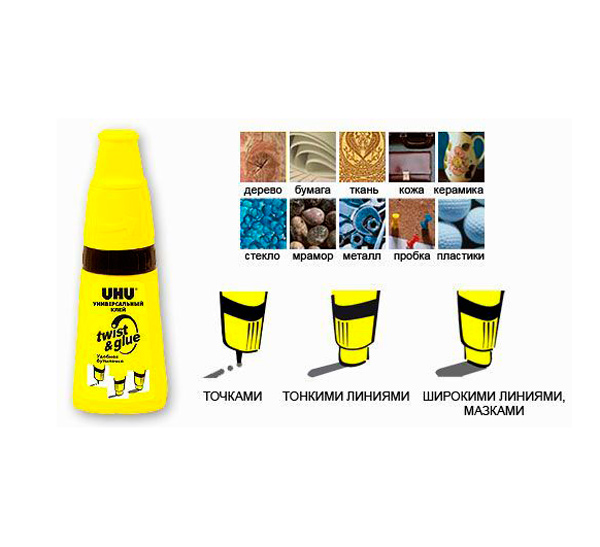 Клей универсальный UHU Twist&Glue. Предназначен для использования дома, в офисе, для дизайнерских работ, а также широко используется в макетировании, например, при изготовлении архитектурных макетов из бумаги и картона. Уникальная головка-аппликатор позволяет наносить клей точками, линиями и широкими полосами. Клей универсален, склеивает почти любые поверхности: металл, бумагу, дерево, текстиль, стекло, керамику, пробку, большинство пластиков, кожу. Не подходит для склеивания полиэтилена, полипропилена, тефлона, силикона, а также бумаги со специальной пропиткой (фото- , термобумага и т.п.). Клей даёт абсолютно прозрачное клеевое соединение, которое безопасно для здоровья. Клеевой шов выдерживает нагревание до +120 °С, при этом длительное тепловое воздействие - до +70 °С. Клей устойчив к воде, не концентрированным кислотам, маслу и бензину; неустойчив к спирту, кетону (ацетону), ацетатным растворителям - этими веществами можно очистить поверхность и руки от клея. Объем: 35 мл.