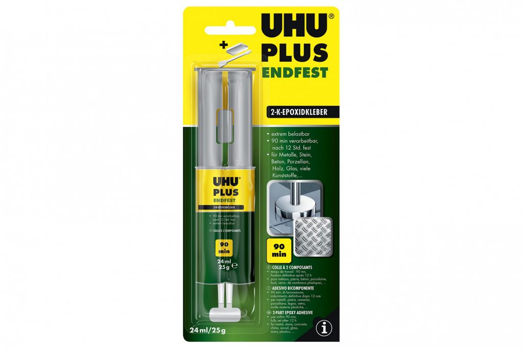 Не содержащий растворителей двухкомпонентный клей UHU Plus Endfest на базе эпоксидной смолы для быстрого и сверхпрочного склеивания большинства материалов. Эксклюзивный продукт UHU. Из серийно выпускаемых двухкомпонентных клеев только UHU Plus Endfest способен выдержать нагрузку 300 кг на 1 см2. Склеивает металл, камень, бетон, мрамор, фарфор, дерево, пластик, резину, стиропор. Имеет ярко выраженные электроизолирующие свойства. Необходимо смешать оба компонента эпоксидного клея в равных частях по объему. Вес: 25 г. В шприце.