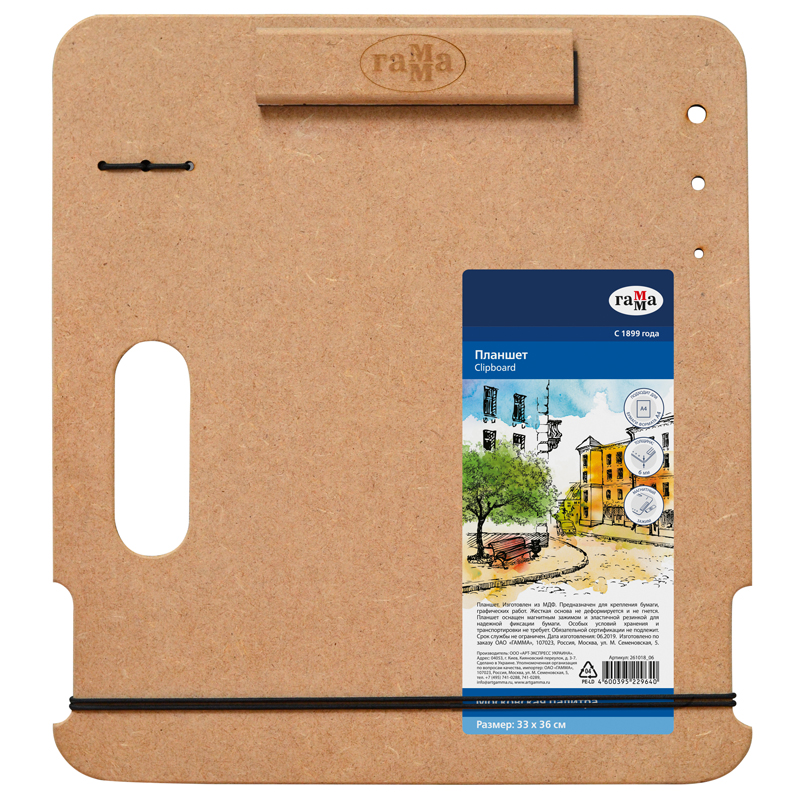 Планшет-клипборд для живописи на пленэрах и вне студии — легкий, тонкий, но прочный. Магнитный зажим и резинка надежно фиксируют лист, не оставляя заломов. Гладкая поверхность не повредит даже тонкую бумагу. Держатели для карандашей и отверстия для кистей позволяют организовать рабочее место. Планшет можно установить на мольберт-треногу или этюдник. Вырубная ручка для удобной транспортировки. Размерный ряд подходит для бумаги форматов бумаги от А4 до А2.
