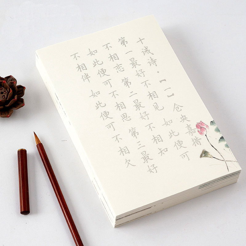 Внутри блока страницы гладкой бумаги с нанесенными контурами стихотворений династии Сун в виде китайских иероглифов. Страницы молочного цвета плотностью 70 гр/м2, каждый лист оформлен мотивами китайской живописи.
