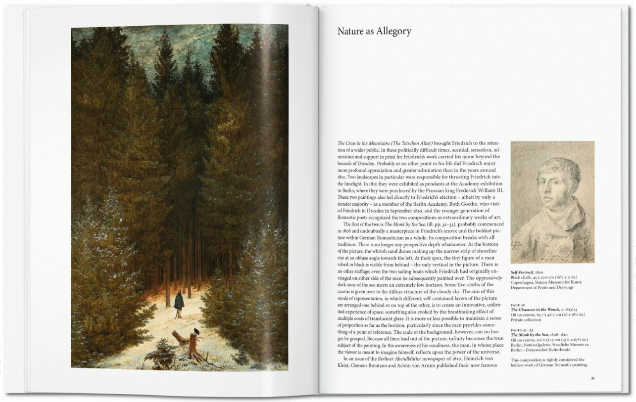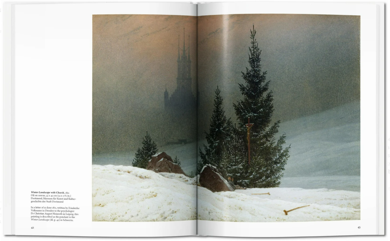 Красота природы и одиночество человека являются доминирующими темами в творчестве Каспара Давида Фридриха (1774-1840). Художник часто помещает маленькую человеческую фигурку на фоне обширного пейзажа, как, например, на его знаменитых картинах "Монах у моря" и "Странник над туманным морем". Долгое время значение и влияние этого великого художника-романтика недооценивалось. Когда Фридрих умер, он был уже забыт своими современниками и был вновь открыт только в начале 20-го века. Сегодня он считается самым значительным немецким художником своего поколения и предшественником экспрессионизма. Однажды Фридрих дал следующий совет своему коллеге-художнику, который был скован академическими правилами: “Закрой свой физический глаз, чтобы сначала увидеть свою картину духовным взором. Затем пролейте свет на то, что вы видели в темноте, чтобы это произвело эффект на других, высвечивая внутреннее из внешнего”. Другими словами, сосредоточенность, а не имитация, суть, а не легкомысленный мазок. Обратите внимание, книга на английском языке.