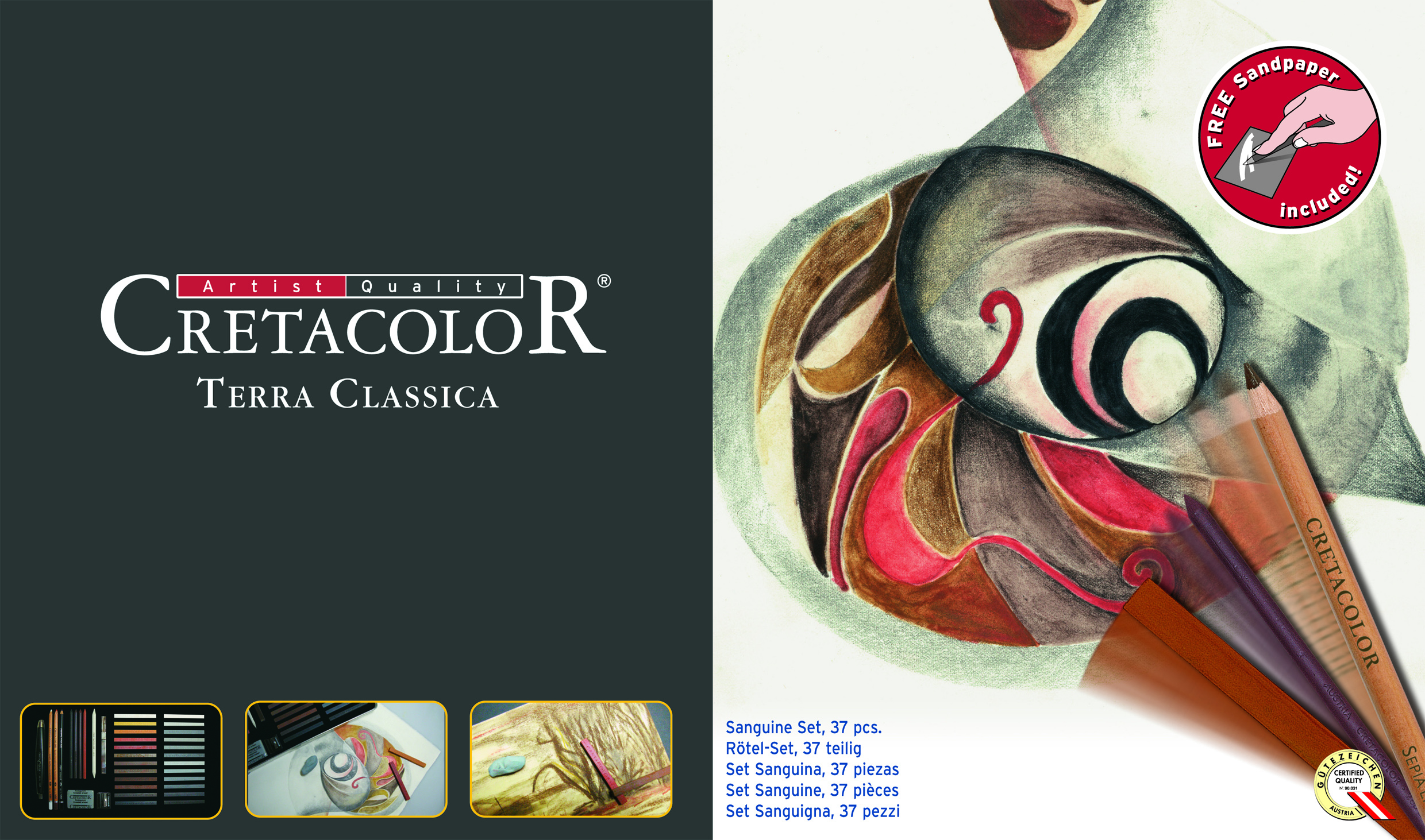 Набор TERRA CLASSICA содержит полный ассортимент художественных материалов для всех техник работы с сангиной: - 24 мелка оттенков коричневого и серого, - художественные карандаши (белый мел, сухая сангина, «Nero»), - стержни 5,6 мм (угольный, светлая и тёмная сепия, сангина масляная), - точилку для художественных карандашей, - ластик-клячку, - растушёвку, - держатель для мелков, - держатель для стержней - и наждачную бумагу.