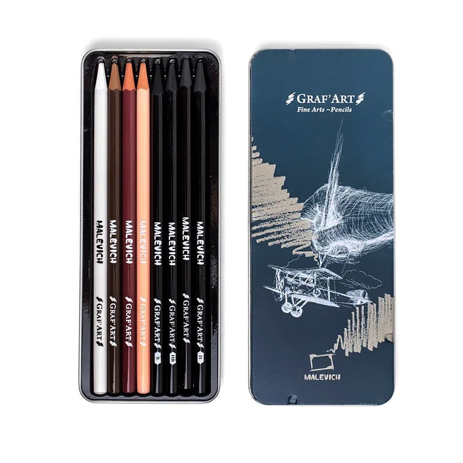 В состав набора входят самые популярные материалы для графики: белый пастельный карандаш, сангина светлая и темная, сепия, угольные карандаши 4 степени жесткости. Карандаши-монолиты, без деревянного корпуса, только грифель. Такие карандаши гораздо удобнее точить и их хватает надолго. Карандаши покрыты лаком и не пачкают руки. Идеальный набор как для выполнения эскизов и наборсков, так и для скетча и полномасштабных художественных работ в графической технике.