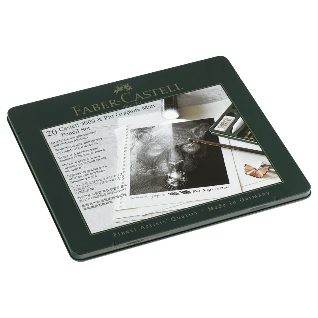 Набор профессиональных художественных принадлежностей "Pitt Graphite Matt" и "Castell 9000" от легендарного немецкого производителя Faber-Castell идеален для художественных работ, создания сложных этюдов и зарисовок. Набор состоит из 20 предметов: 8 карандашей Pitt Graphite Matt твердостью HB, 2B, 4B, 6B, 8B, 10B, 12B, 14B; 8 карандашей Castell 9000 твердостью B, 2B, 3B, 4B, 5B, 6B, 7B, 8B. В дополнение к набору - 1 растушевка,1 ластик, 1 ластик-клячка, 1 металлическая точилка с одним отверстием.