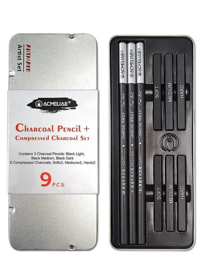 Набор высококачественных художественных угольных материалов для графики, 9 штук: черный угольный карандаш - 3 шт, прессованный уголь – 6шт. Металлический футляр. Универсальны в рисовании, обладают огромными возможностями в передаче света и тени. Удобны для проработки контуров и мелких деталей, скетчинга, эскизов, набросков, графики, портретов, живописи. Грифель мягко рисует по бумаге. Три черных угольных карандаша Light, Medium, Dark разной степени твердости и насыщенности. Затачивается канцелярским ножом. Не пачкает руки. Длина: 175 мм. Форма корпуса: круглая. Корпус из натуральной древесины. Уголь прессованный для рисования отлично подходит, когда нужен глубокий черный цвет. В наборе 6 художественных мелков разной твердости – мягкий (soft), средний (medium), жесткий (hard). По две штуки каждой твердости для разных задач. Для графики, зарисовок. Густой насыщенный цвет. Бархатистая текстура. Форма сечения угля квадратная, размер 10x10x80мм. Можно прорисовывать тонкие и широкие линии, а также закрашивать большие поверхности. Рекомендуется закреплять выполненную работу лаком-фиксатором.