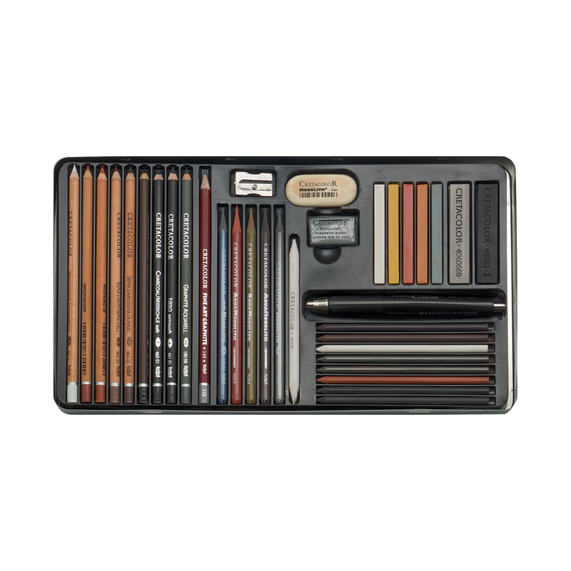 Большой набор материалов для графики включает 36 инструментов и материалов. В набор входят: карандаши и стержни для эскизов, водорастворимые графитовые карандаши, графитовые карандаши Monolith и водорастворимый графитовый карандаш Monolith, акварельные карандаши Aqua Monolith, коричневые и серые мелки, уголь, графитовые палочки и ластик-клячка , ластик Monolith, растушёвка, точилка и держатель для стержней. Поставляется в металлическом пенале.