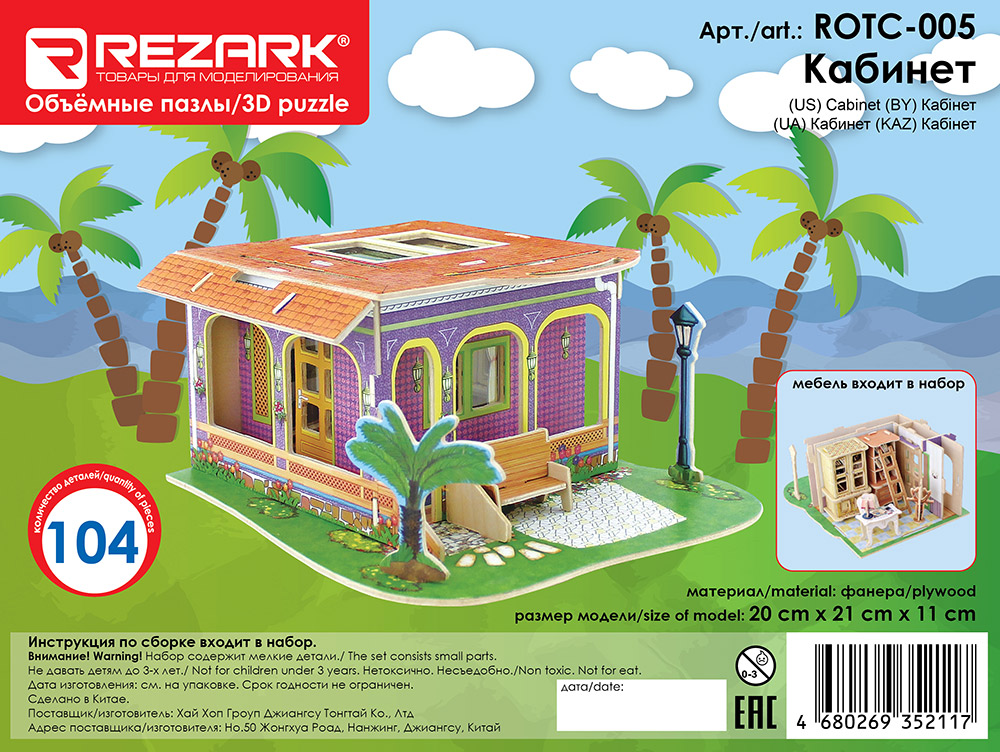 Серия детских домиков Rezark - это объемные 3D пазлы из фанеры 3 мм с нанесенным на нее принтом. Чтобы придать красочный вид модели, производитель использует специальное оборудование, которое склеивает цветную картинку с листом фанеры. Цветная печать в наших наборах высокого качества, хорошо проработана детализация рисунка даже в мелких частях модели. Серия состоит из 5-ти наборов: кухня, ванная комната, иная , спальня, кабинет. Все они скрепляются между собой и образуют большой загородный дом. Мебель входит в набор! Для сборки не требуется клей, все детали скрепляются соединением в пазы. Подходит для детей дошкольного возраста. В комплекте имеется подробная инструкция по сборке на русском языке, которая будет понятна и взрослому и ребенку. Размер собранной модели: 20 x 21 x 11 см. Количество деталей: 70