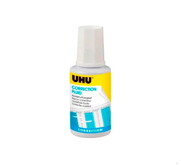 Корректирующая жидкость Uhu. Мгновенно высыхает в виде гладкой, ровной поверхности, обеспечивая быстрое нанесение повторной надписи, а идеально ровный и гладкий штрих гарантирует полное закрашивание с первого раза. Может использоваться на всех типах бумаги, включая термобумагу для факса. Не оставляет следов исправления при ксерокопировании. Создана на основе специальной эмульсии, которая со временем не засыхает, сохраняя жидкую консистенцию, не образует комочков и не требует растворителя. Объем: 20 мл.
