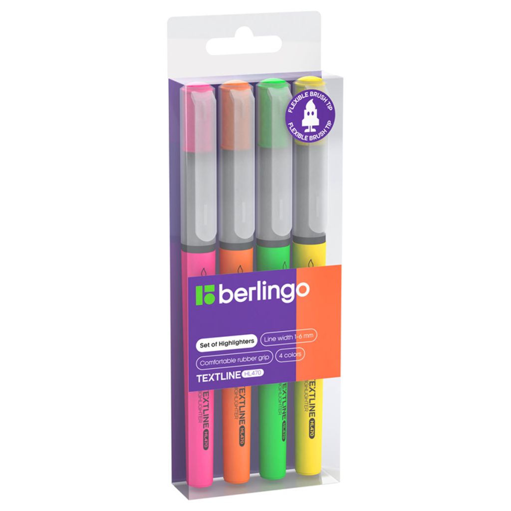 Набор текстовыделителей с пишущим узлом в форме кисти позволяет максимально свободно варьировать ширину линии письма и использовать выделители не только в учебных, но и художественных и прочих креативных работах. В текстовыделителях использованы неоновые чернила классических цветов. Корпус выделителей выполнен с мягким резиновым грипом, значительно повышающим комфорт при использовании, и окрашен в цвет чернил, что значительно облегчает поиск нужного оттенка. Удобный пластиковый клип позволяет легко закрепить текстовыделители на блокноте, ежедневнике или планшете. Набор содержит 4 текстовыделителя: желтый, оранжевый , розовый, зеленый.