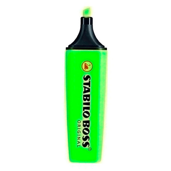Текстовыделитель Stabilo Boss. Предназначенный для маркировки текста на различных типах бумаги, включая факсовую. Эргономичный корпус изготовлен из пластика. Чернила зеленого цвета на водной основе не имеют запаха, мгновенно высыхают, отличаются высокой яркостью и светостойкостью. Клиновидный стержень, способный долгое время сохранять работоспособность без колпачка, позволяет проводить идеально ровные линии толщиной от 2 до 5 мм.