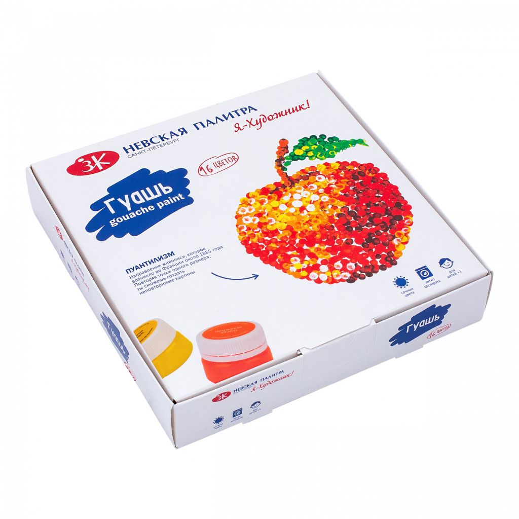 Отличительная особенность гуаши яркие и насыщенные цвета. Легко отмывается с поверхности. Сохраняют цвет после высыхания, приобретают бархатистую текстуру. При нанесении толстым слоем не растрескиваются. При разведении водой приобретают свойства акварели – ложится полупрозрачным равномерным слоем. Состав: Белая, лимонная, желтая, охра, оранжевая, красная или алая, красно-коричневая, розовая, фиолетовая, синяя, голубая, сине-зеленая, зеленая светлая, зеленая темная, коричневая, черная.