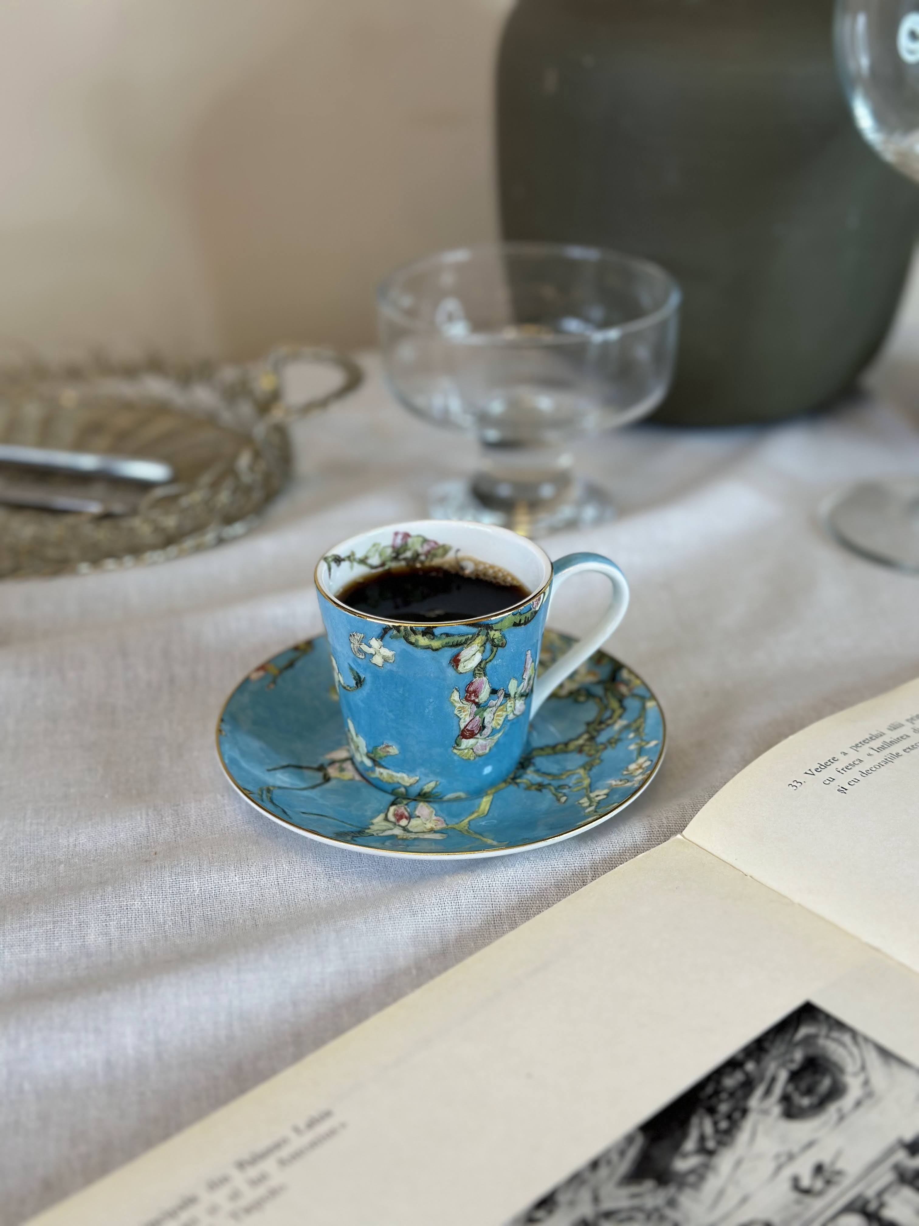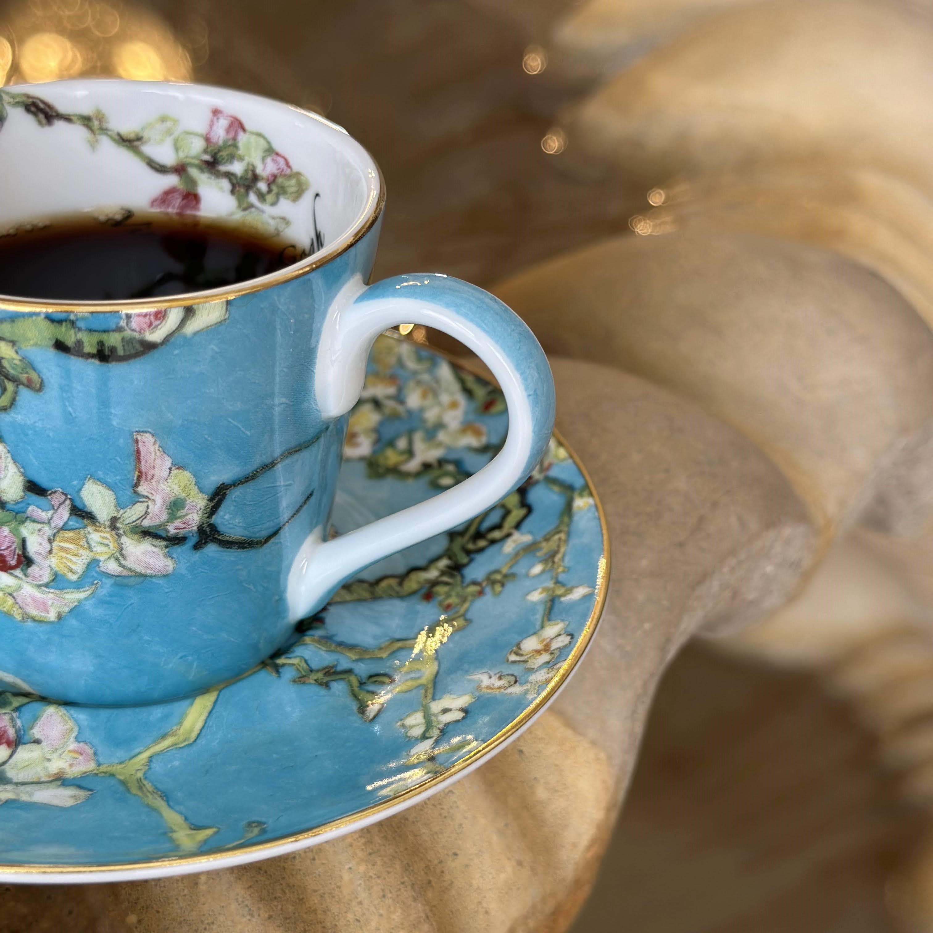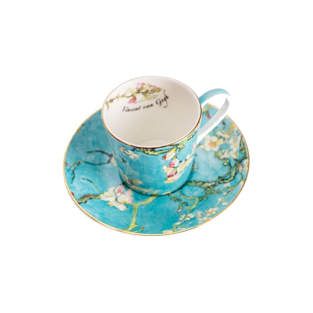 Кофейная пара, чашка и блюдце, создана из тонкостенного китайского фарфора с изображением знаменитого произведения искусства. Миндаль цвёл и во времена Винсента Ван Гога, и даже до расцвета Древней Греции. Он цвёл ещё тогда, когда первые люди изобретали первую мифологию. Можно бесконечно всматриваться в эти цветы и небо, кто-то увидит просто чашку с блюдцем, а кто-то — молчаливое созерцание рождения и перерождения человеческой культуры. Объём 80 мл.